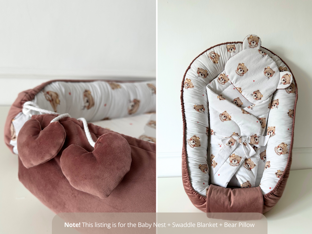 BUNDLE: Baby Nest + Swaddle Blanket + Bear Pillow